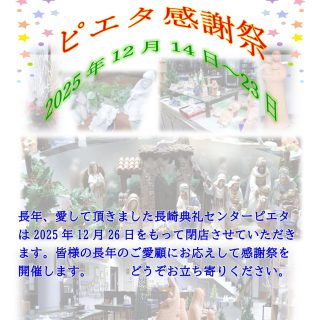 12月14日から長崎典礼センター「ピエタ」の感謝祭が開催中です。ぜひお立ち寄りください。■ 感謝祭期間:2025年12月14日(日)~23日(火)《営業時間》9:30~17:30 日曜日のみ 9:30~12:00 ※期間中は休業なし場所:長崎典礼センター「ピエタ」 長崎市上野町2-4長年、愛していただきました長崎典礼センターピエタは2025年12月26日をもって閉店させていただきます。皆様の長年のご愛顧にお応えして感謝祭を開催します。どうぞお立ち寄りください。今後は、ネットショップピエタ pddm( )と東京ピエタをご利用ください。師イエズス修道女会一同